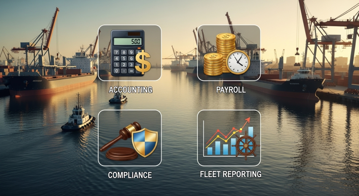 Most maritime companies outsource accounting, crew payroll, and compliance documentation first. These areas are complex, time-consuming, and highly regulated, making them ideal for specialized external teams.
